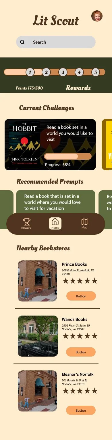 The main idea that I came up with is that different prompts would guide the user to find books at different local bookstores to complete these prompts. Furthermore, I would create a reward system to keep the user engaged with the app and push them to interact and by from the app.