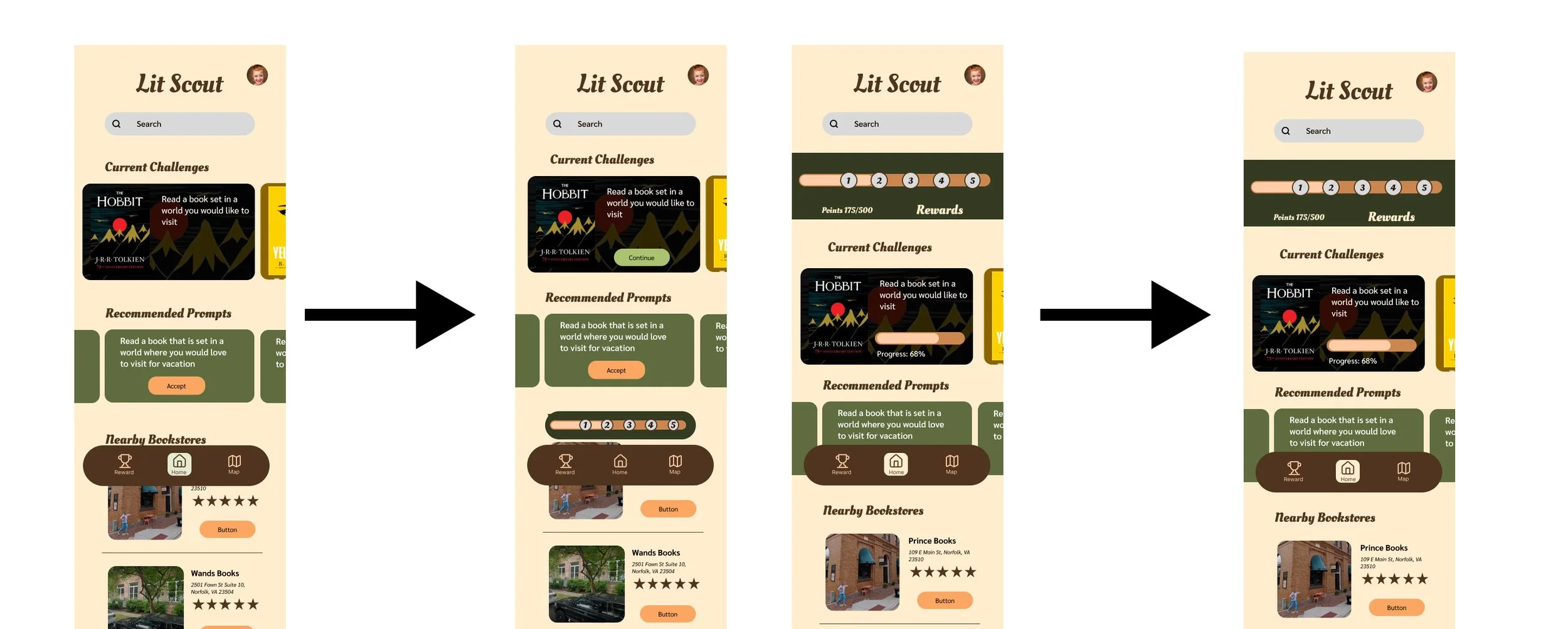 When creating the user flow, one of my main goals is to get the user into the bookstore by completing the prompts or just through their explorations. Furthermore, to incentivise them through the reward system to buy books and get into bookstores.